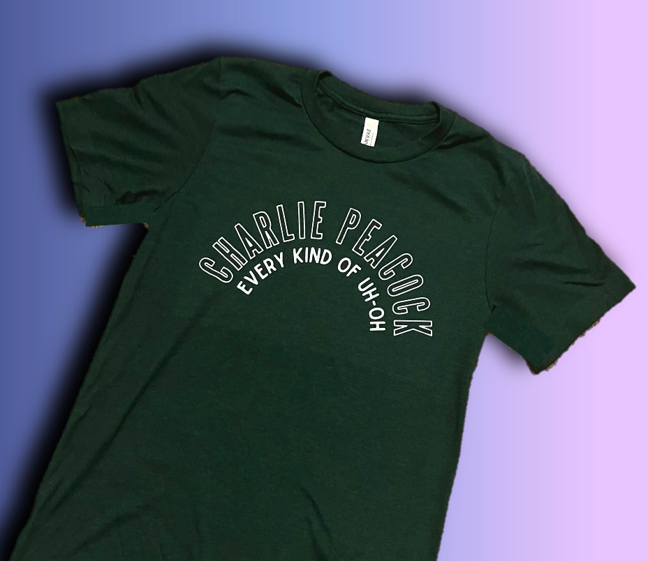 Support the new 2024 album by Charlie Peacock, Every Kind of Uh-Oh with the limited edition dark green tee.